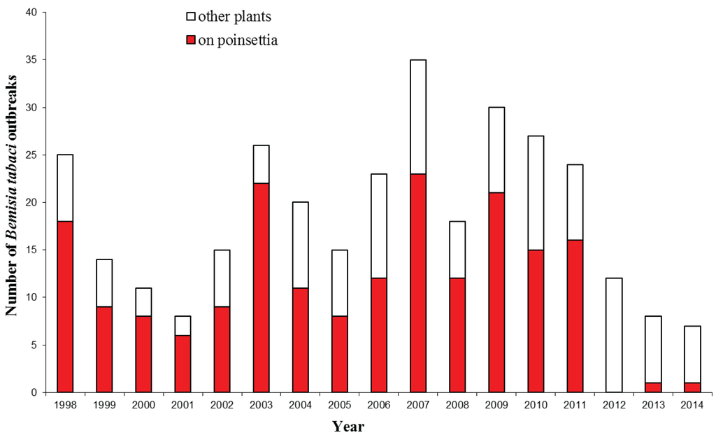 The number of Bemisia tabaci outbreaks in England and Wales (1998‒2014) (updated from Cuthbertson [15]).