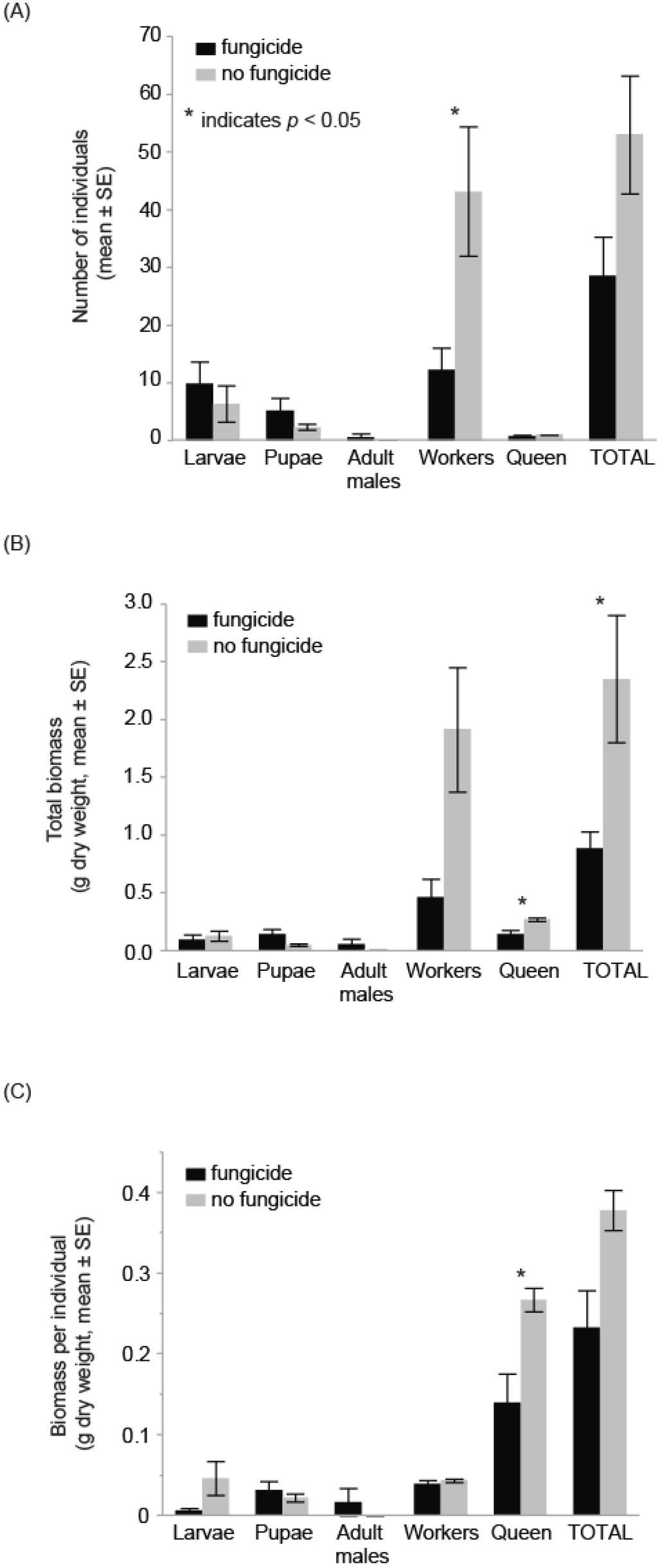Colonies exposed to the fungicide treatment (n = 5) produced less than a third as many workers (mean ± SE, fungicide 12.2 ± 3.8 vs. control 43.2 ± 11.2, F1,9 = 6.8, p = 0.03), less than half the amount of bee biomass (fungicide 0.91g ± 0.15 vs. control 2.36g ± 0.55, F1,9 = 8.3, p = 0.02) and had mother queens with half the body mass (fungicide 0.14g ± 0.04 vs. control 0.27 ± 0.01, Z = 2.5, p = 0.01) as compared to colonies in the no-fungicide control treatment (Table 1, Figure 1). The number of larvae, pupae, and males did not differ between treatments (Table 1). The biomass of each individual life stage (larvae, pupae, workers, and adult males) also did not differ (Table 1), nor did the weight per individual for larvae, pupae, and workers (Table 1). There were insufficient data to analyze the weight per individual for adult males by treatment.