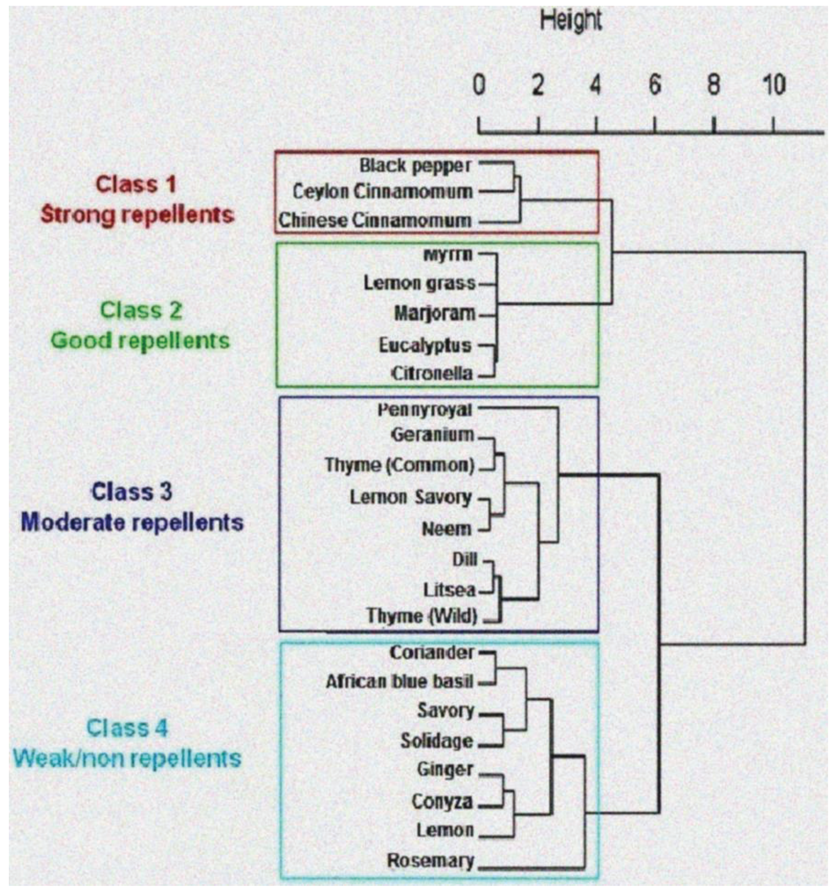 Based on the Hierarchical Ascendant Classification (HAC) analysis of repellence effects, the different plant extracts were categorized into to four classes: strong (Class 1), good (Class 2), moderate (Class 3) and weak or non repellent (Class 4). Piper nigrum, C. zeylanicum and C. cassia extracts were classified as strong repellents (Class 1), while C. myrrha, C. citratus, O. majorana, E. globulus and C. nardus were found to be good repellents (Class 2). Eight extracts were moderately repellent (Class 3); these were: M. pulegium, P. graveolens, T. vulgaris, S. biflora, M. azadirachta, A. graveolens, L. cubeba, and T. satureioides. As compared to the other extracts, the remaining eight extracts were weak or non repellent (Class 4). These were: C. sativum, O. kilimandscharicum, S. abyssinica, S. canadensis, Z. officinale, C. newii, C. limon and R. officinalis (Figure 2).