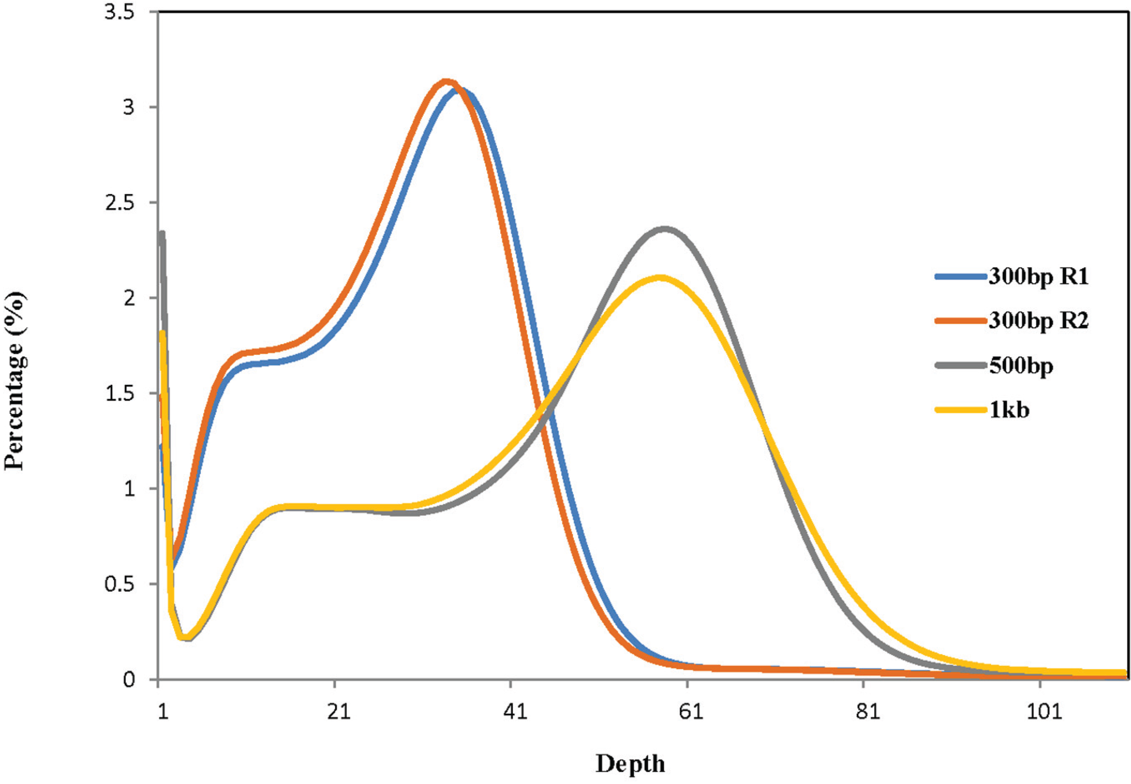 Distribution of unique k-mer depth. The depth of k-mers (size of 27) was plotted against the frequency at which they occurred. Unique k-mers were identified from left (R1) and right (R2) paired-end reads from the library with insert size of ~300 bp, and from all paired-end reads from libraries with insert sizes of 500 bp and 1 Kb, respectively. The peak of the k-mer depth distribution was 35, 33, 58 and 57, respectively. The left smaller peaks indicated a certain degree of heterogeneity of the materials used for genome sequencing of B. tabaci MEAM1.