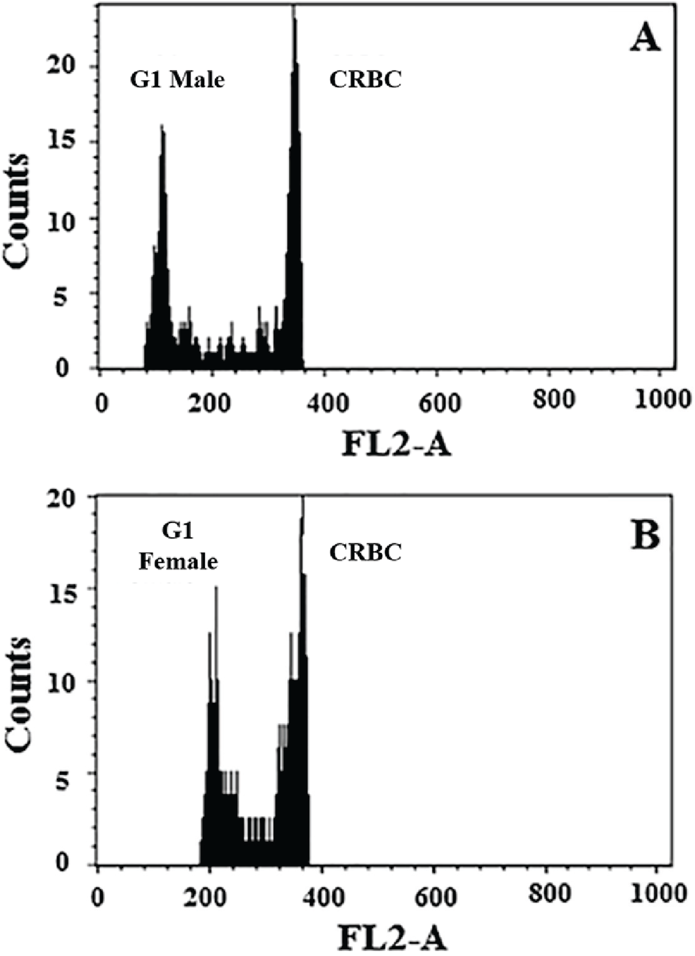 Flow cytometric estimation of the nuclear DNA content of haploid male and diploid female B. tabaci MEAM1. Histograms represent relative fluorescence of stained nuclei of male (A) and female (B) whiteflies relative to the internal standard, chicken red blood cells (CRBC). X-axis = relative nuclear DNA content; Y-axis = number of nuclei.