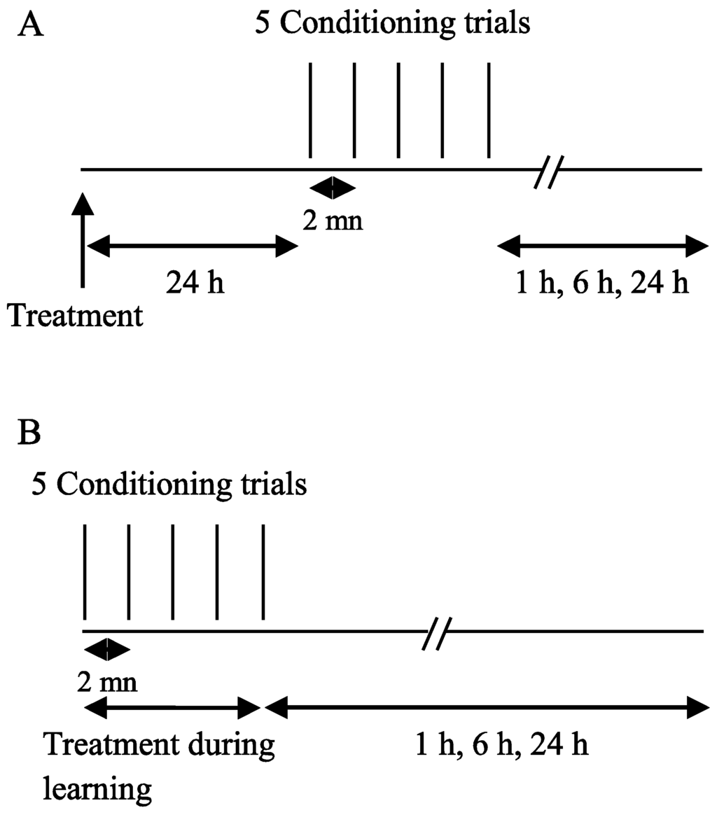 Two oral exposure protocols were used (Figure 1): (1) forager bees were fed with ACT, DEL, or sucrose solution 24 h before learning sessions; the retention sessions were tested at 1 h, 6 h, and 24 h after learning (Figure 1A); (2) forager bees were fed with drugs or sucrose during the five learning trials and then the retrieval was estimated 1 h, 6 h, and 24 h after learning trials (Figure 1B).