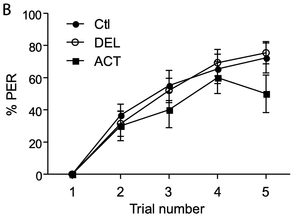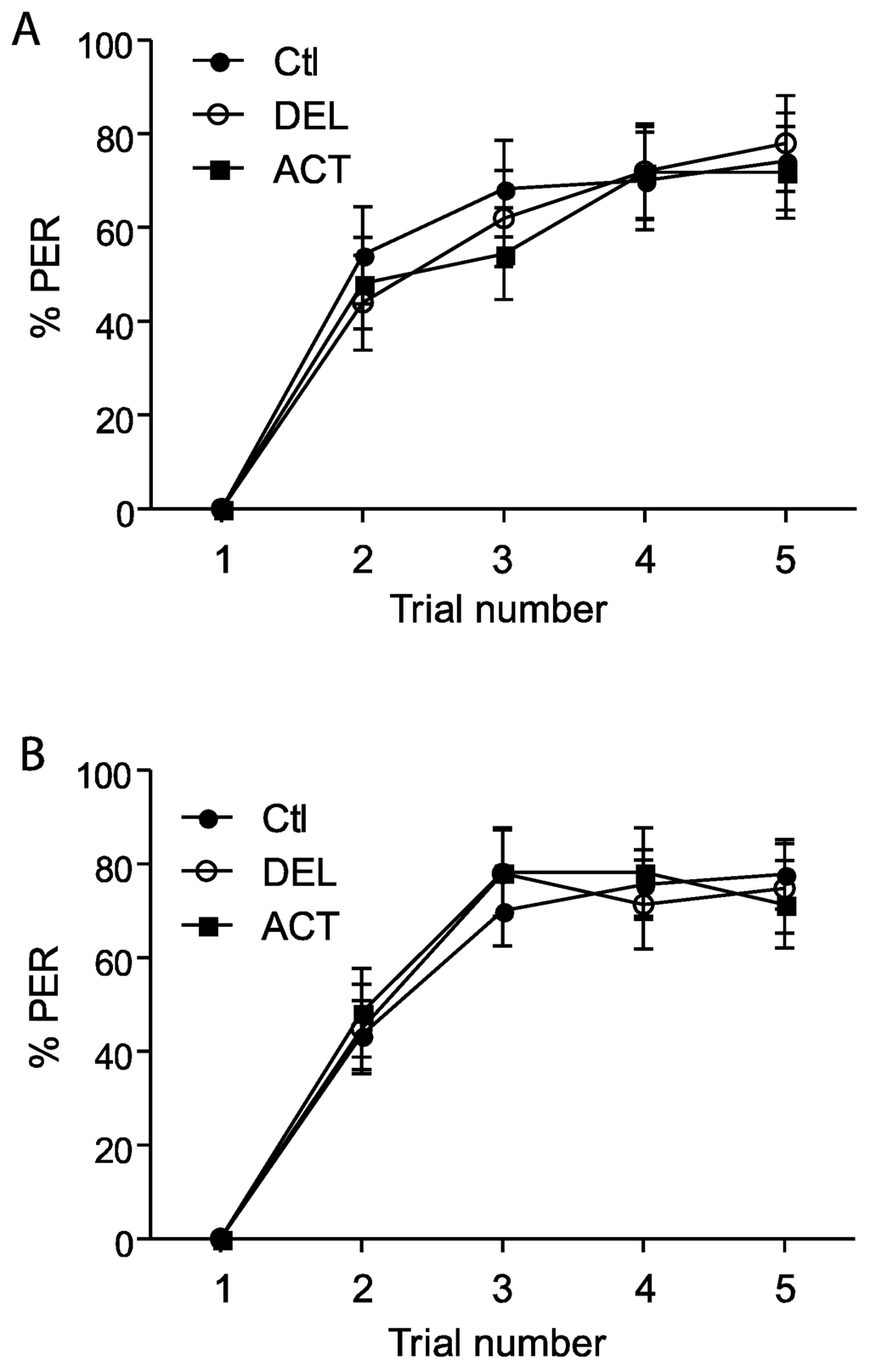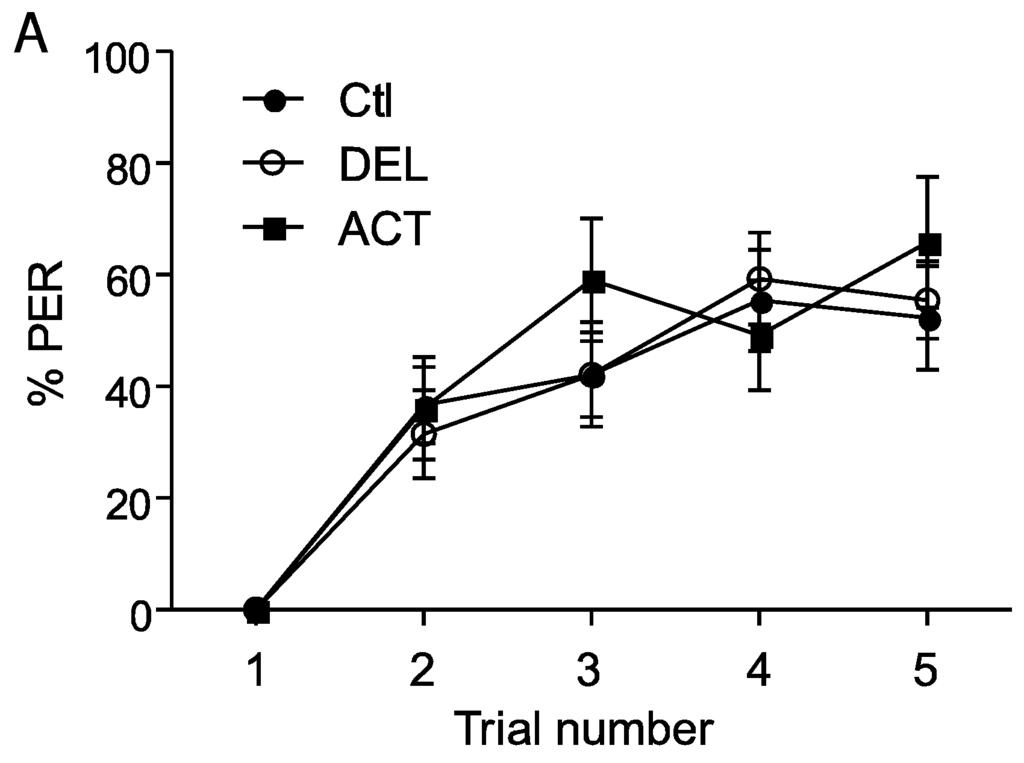 PER responsiveness of honey bee when drugs were applied during learning sessions. (A,B) bees treated with 10 ng/bee or 100 ng/bee of ACT or DEL, respectively. The learning performance is expressed as the percentage of PER to antennal stimulation with 40% sucrose solution. Each group represents n = 90 bees. Bars represent standard errors. Acetamiprid (ACT), deltamethrin (DEL), and control group (Ctl).
