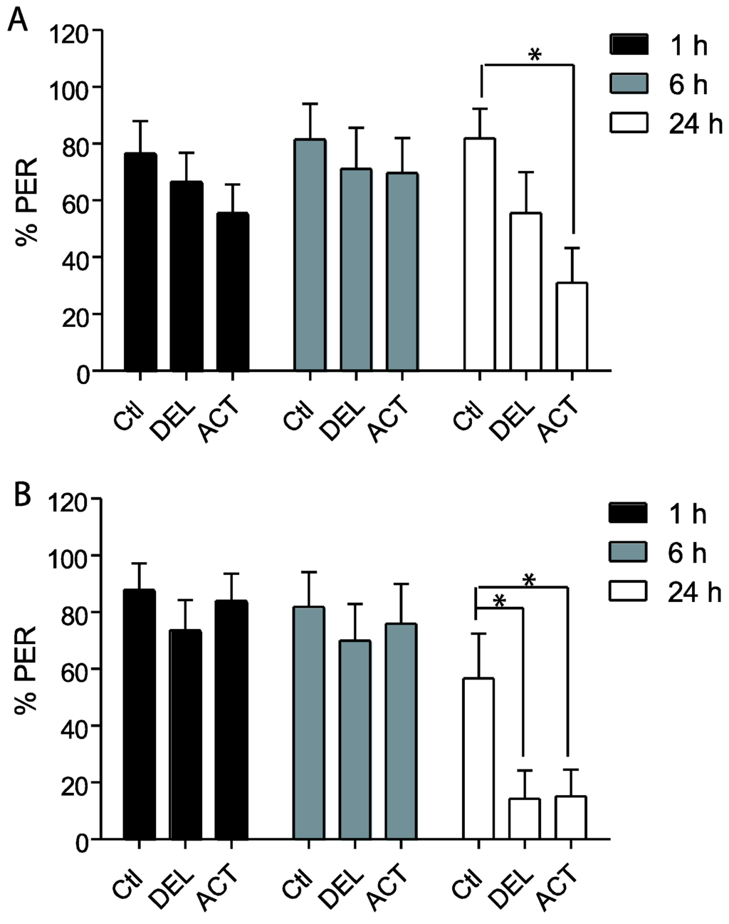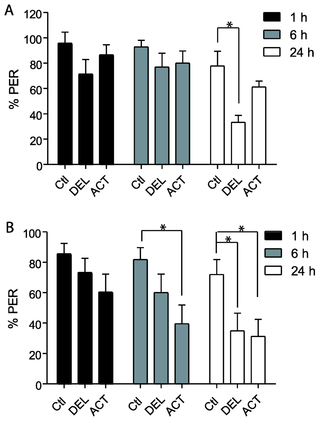 In the first experiments, drugs were applied 24 h before the conditioning of the PER and the retrieval was tested at 1 h, 6 h, and 24 h after conditioning (See Figure 1A). After oral intoxication, ACT and DEL did not alter the learning sessions (Figure 2). Similar results were found at both 10 ng (Figure 1A) and 100 ng (Figure 1B) concentrations. These trends indicate that ACT and DEL have no effect on learning performance. No statistical significant differences were found between control and tested forager bees (p > 0.005). At the low and high doses tested, both ACT and DEL appear therefore not to be able to disturb learning performance. Interestingly, looking at retrieval performance, it appeared that at 10 ng/bee, DEL disturbed retrieval of PER at 24 h after conditioning. Significantly different results were found between DEL-treated bees (p = 0.0072, n = 90, Figure 3A) and control groups. Similar results were also demonstrated at 100 ng/bee with DEL at 24 h (p = 0.0087, n = 90, Figure 3B) and ACT at both 6 h (0.024, n = 90, Figure 3B) and 24 h (p = 0.030, n = 90, Figure 3B) after learning sessions. These results suggest that at a lower dose, DEL is more toxic than ACT on retrieval performance despite the fact that we found a decrease in PER responses for ACT compared to control groups, at 24 h (no statistical difference, see Figure 3A).