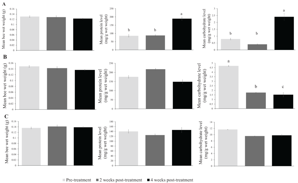 In the spring, there was no significant effect of treatment (F3, 11.1 = 0.654, p > 0.05), sampling time (F2, 22.0 = 1.788, p > 0.05), or their interaction (F6, 22.3 = 0.942, p > 0.05) on bee wet weights (Table 1; Figure 1B). Similar results were obtained for total protein levels in bees (treatment: F3, 14.6 = 1.043, p > 0.05; sampling time: F2, 27.5 = 1.931, p > 0.05; interaction: F6, 26.9 = 0.796, p > 0.05) (Table 1 and Table 2; Figure 1B). There were also no significant treatment (F3, 11.6 = 0.512, p > 0.05) (Table 1) or interaction (F6, 18.8 = 2.281, p > 0.05) effects on total carbohydrate levels during the spring; however, carbohydrate levels differed significantly among the three sampling times (F2, 18.6 = 24.247, p > 0.05). Mean carbohydrate levels were significantly higher at pre-treatment sampling, but decreased significantly at the 2-week and 4-week post-treatment samplings (Table 2; Figure 1B).