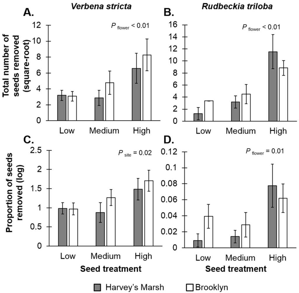 Seed treatment and site comparisons of Verbena stricta (left side) and Rudbeckia triloba (right side) on the total number of seeds removed (A,B) and the proportion of seeds removed after 48 h of exposure (C,D). Grey bars represent rates at Harvey’s Marsh (a low resource density site); white bars represent rates at Brooklyn (a high resource density site). Error bars represent ±1 SE. The total number of seeds removed was square-root transformed, and the proportion of seeds removed was log-transformed.