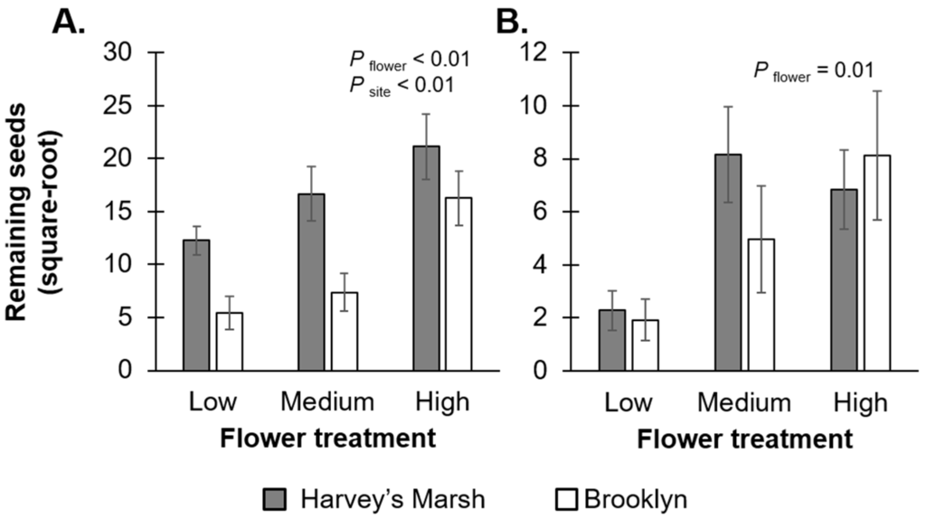 Flower treatment and site comparisons on the overall number of seeds remaining after the pollination and seed predation experiments on Verbena stricta (A) and Rudbeckia triloba (B). Grey bars represent rates at Harvey’s Marsh (a low resource density site); white bars represent rates at Brooklyn (a high resource density site). Error bars represent ±1 SE. Remaining seed numbers were square-root transformed.