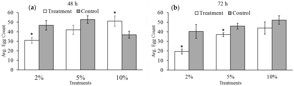 For the baseline reproductive study, the number of eggs laid and percentage of progeny that develop into adults were compared statistically using Analysis of Variance (ANOVA) to determine if reproductive rates were different depending on the age of the female bruchid. Comparisons of average reproductive output and final adult emergence between treatment and control groups was performed using a Student’s t-test (2-sample, equal variance, p < 0.05). When needed, comparisons between the two, exposure-time treatments (48 and 72 h) were also compared using Student’s t-test.
