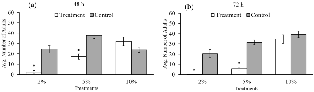 Average number of progeny emerged from bruchid eggs laid by female bruchids exposed to low oxygen for (a) 48 and (b) 72 h and under normal oxygen. Asterisks represent statistically significant differences between oxygen treatment groups (white) and paired control groups (gray). Bars with no asterisk were not significantly different from the control group. The 2% and 5% oxygen treatments significantly reduced progeny development, while 10% oxygen did not result in the same effect.