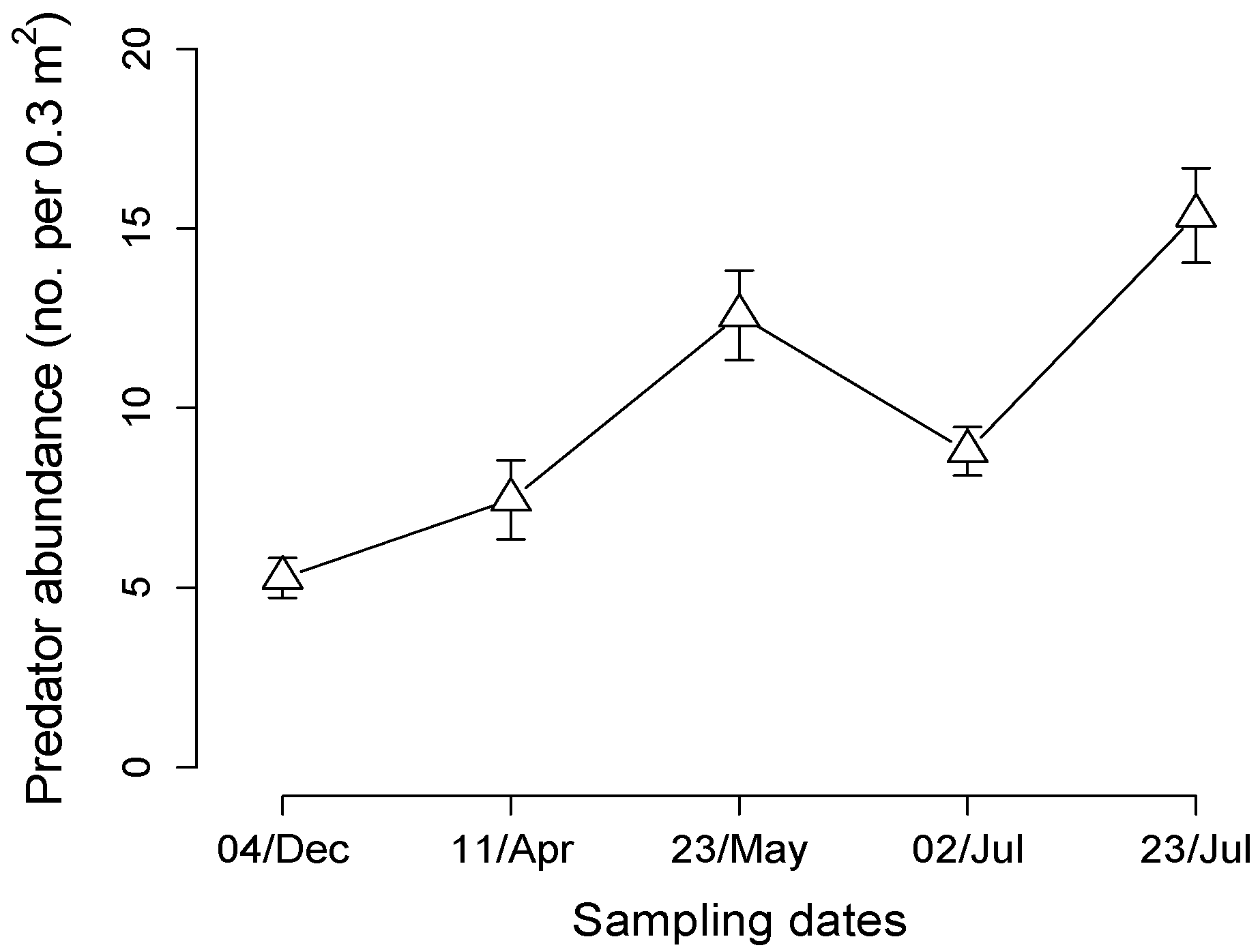 Predator abundance in field plots across the growing season. Predators were sampled within the center of one-acre plots using suction sampling of area within three placements of Daubenmire frame. Symbol represents mean abundance of all predator groups pooled over 15 plots for each date (bar indicates ± 1SEM).