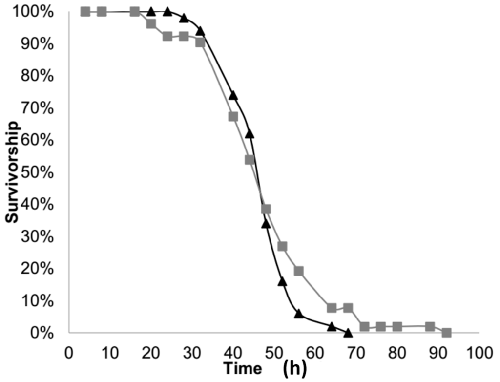 The neonates in the “completely-starved” group were placed in a plastic vial with no food. Larval survivorship was checked every 4 to 8 h until all larvae were dead. This was replicated fifty times. For each individual larva the total longevity was calculated as the time it was placed in the plastic vial to the last time-interval it was noted as being alive. In addition, the proportion of larvae that survived to each time interval was calculated.