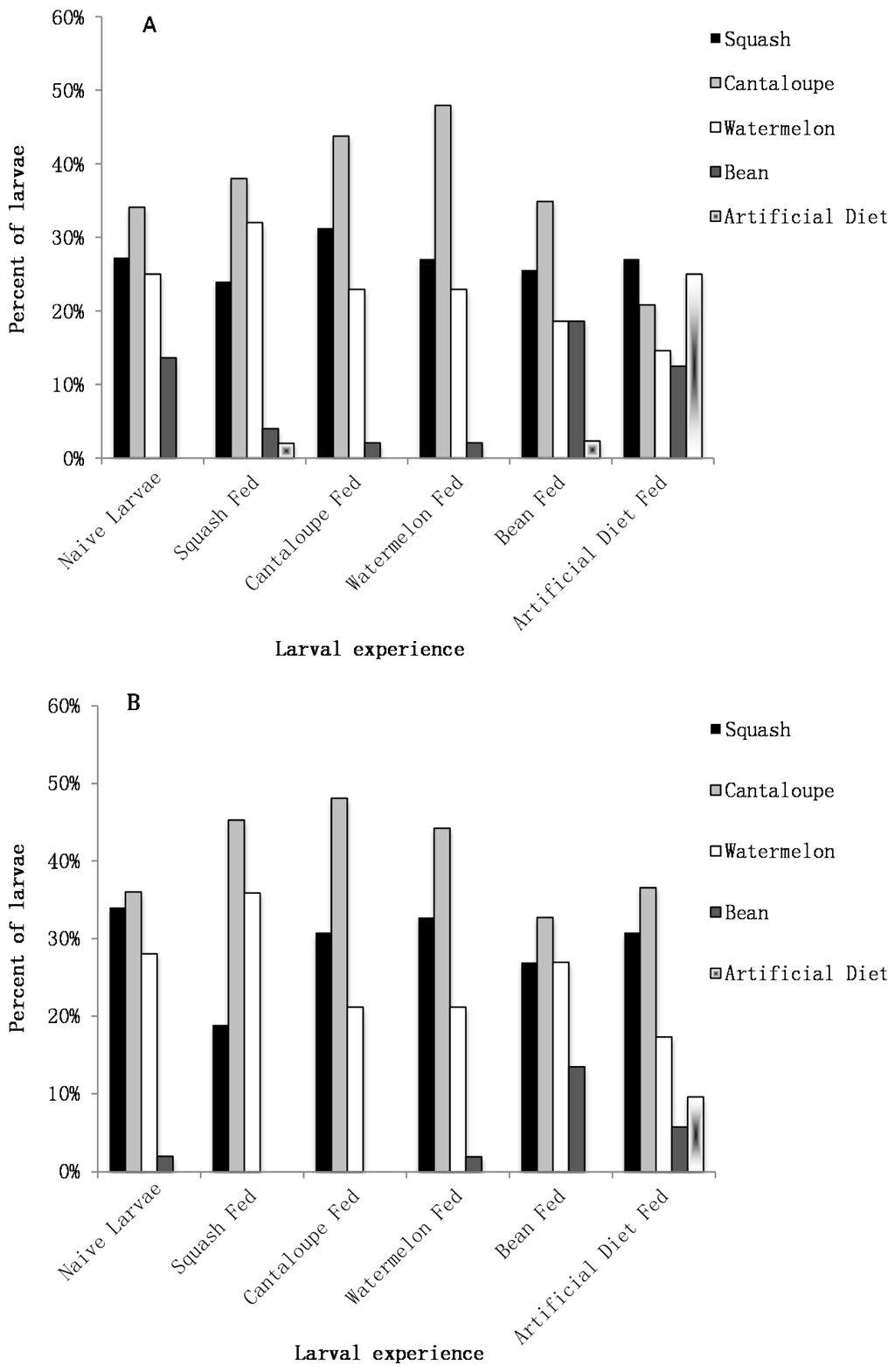 As described above, all of the larvae in this experiment were settled after a 24-h period. The larvae that had prior experience feeding on squash did not settle on all five food sources equally, X2 (df = 4, N = 53) = 48.33, p < 0.001, nor all four plant species, X2 (df = 3, N = 53) = 25.26, p < 0.001; none of the larvae chose to settle on the artificial diet or the bean leaf; all settled on one of the cucurbits. However, the larvae settled on the three cucurbits equally (X2 (df = 2, N = 53) = 5.72, p > 0.05) (Figure 2B). Five larvae switched food sources between the orientation and settlement recording.