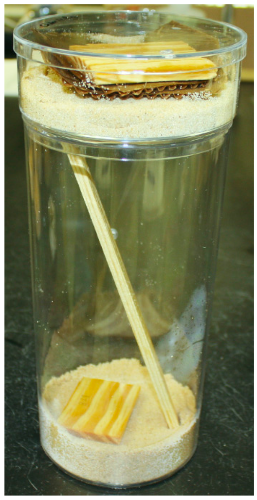 To prepare the bottom foraging site, a tall round clear acrylic container (11 cm diameter × 21 cm high, Pioneer Plastics©, North Dixon, KY, USA) was partly filled with ~400 g of autoclaved treated sand and a wood block of similar size as on the top container was placed on the sand surface. Three chemicals each with two concentrations, 1 ppm and 10 ppm were tested. To treat the sand, first autoclaved sand was held in a sealable plastic bag and the required amount of chemical mixed with distilled water (the amount of distilled water was calculated to make the moisture content of sand 10%) was added. The bag was then sealed and kneaded thoroughly to mix the chemicals uniformly in the substrate. Controls received moist sand with no added termiticide. A small hole was made about the middle height on one side of the container to add water when necessary. A slit was made on the lid in a way that it was aligned with the hole of the top container. A 21-cm-long wooden stake was used as a ramp connecting the top and the bottom foraging sites. One end of the stake was placed on the surface of the bottom substrate and the other end was inserted through the hole to reach the substrate on the top container so that the ramp connects at an angle of ~60°.