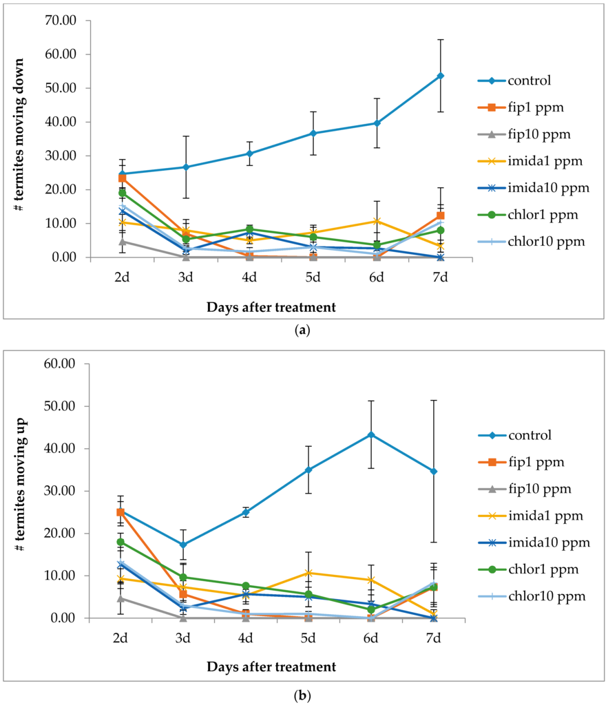 (a) Mean number of termites (±SEM) moving downward on the ramp in 5 min observation period from day 2 to day 7 after treatment; (b) Mean number of termites (±SEM) moving up on the ramp in 5 min observation period from day 2 to day 7 after treatment.