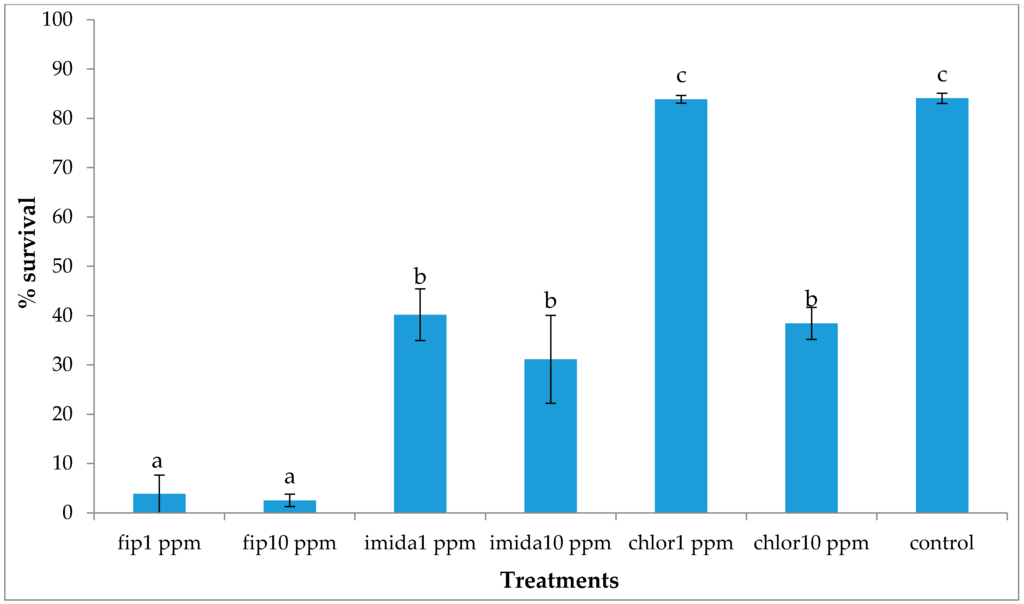 Mean % survival (±SEM) at one month (12 days for fip10 ppm) after treatment. Means with the same letters are not significantly different (p > 0.05) using Tukey’s HSD means separation.