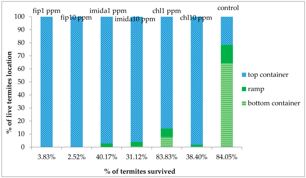 For all three chemicals tested, a proportion of the released termites were alive at the end of the experiment and they looked healthy and active. The live termites were all on the top foraging sites, except a small proportion that was retrieved from the upper part of the ramps. None were collected from the bottom foraging sites which had the treated substrate. We suspect that different impacts may be seen between termites traveling a vertical distance versus a horizontal distance. Previous researchers [10,12,13] conducted laboratory studies to test the mortality of termites beyond the treated site based on horizontal distance alone. There are no reports of using vertical distance measures. Su [12] reported the clogging/blockage of tunnels by dead termites, thus severing the contact after a certain percentage of termites were dead. There was no clogging/blockage in our study as no shelter tubes were constructed on ramps in the treatments except in the 1 ppm chlorantraniliprole treatment. However, the number of termites moving down the ramp was fewer and fewer as the days passed by and almost no termite movement was observed at or after 20 days of treatment. We suggest that the cessation of termite movement to the bottom container was due to the repellent effects from dead termites covered with fungus.