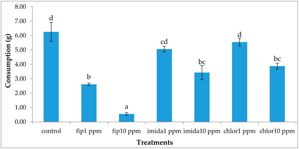 Mean total food (top wood, top cardboard, ramp and bottom wood) consumption (±SEM) after one month (12 days for fip10 ppm) of treatment. Means with the same letters are not significantly different (p > 0.05) using Tukey’s HSD means separation.
