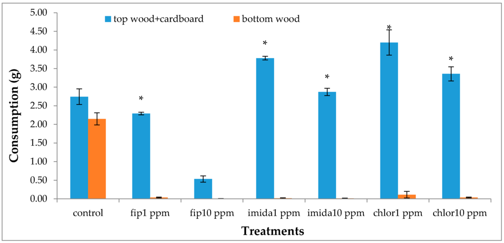 Comparison of mean food consumption (±SEM) between top foraging site and bottom foraging site within the same treatment after one month (12 days for fip10 ppm) of treatment. Top foraging site consumption included consumption of wood and cardboard and bottom foraging site consumption included consumption of wood only as there was no cardboard there. Asterisk (*) on top of graph bars shows significant difference between top and bottom foraging sites within the same treatment.