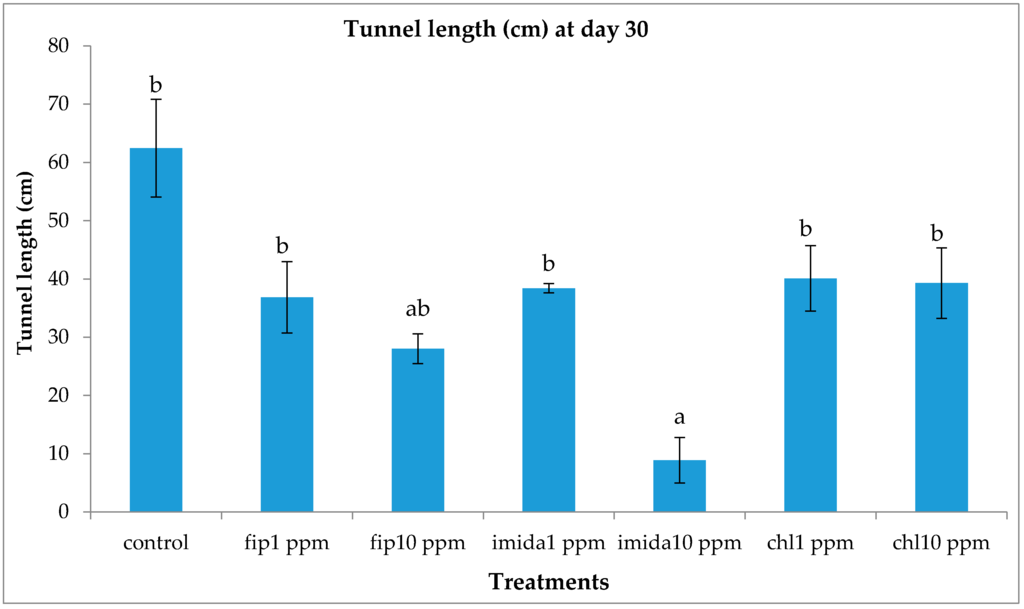 Treatments had a significant effect on the length of the tunnels on the bottom foraging container measured at the end of the experiment (df = 13, 28; F = 146.18; p < 0.0001). The tunnel length was significantly shorter in the 10 ppm imidacloprid treatment compared to the five other treatments and controls. The five treatments had more or less similar tunnel lengths, which while shorter than the controls, the difference was not statistically significant (Figure 8).