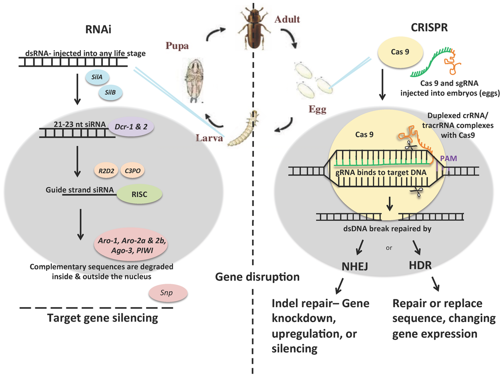 Schematic of RNA interference (RNAi) (a) and CRISPR-Cas (b) technology in Tribolium castanem. The grey oval represents the cell nucleus. On the RNAi side (a), dsRNA can be injected into any life stage. The double stranded RNA (dsRNA) is incorporated into the cell with SilA and SilB (SID-1 orthologs). Dcr-1 and 2 (Dicer) cleave the dsRNA into 21 nt pieces, R2D2 and C3PO help load the RNAs into the silencing complex. Aro-1, 2a, 2b, 3, and PIWI endonucleases degrade the complementary RNA inside the nucleus while Snip (SNP) exonuclease degrades the complementary RNA outside of the nucleus. On the CRISPR side (b), Cas9 and single guide RNA (sgRNA) is injected into eggs. Duplexed crRNA/tracrRNA complexes with Cas9 endonuclease, resulting in a precise dsDNA break. The break is repaired by either non-homologous end joining (NHEJ) or homology-directed repair (HDR), which results in gene knockdown, upregulation, silencing, or changes in gene expression.