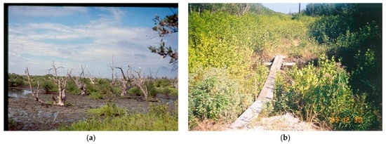 Many methods are available to help control mosquito production from wetlands [18]. For example, along Florida’s east coast many salt marsh or mangrove forest areas produce huge populations of Aedes taeniorhynchus and Aedes sollicitans that are effectively controlled using impoundments. These species of mosquitoes do not lay their eggs on standing water but prefer moist marsh soils [19]. Dikes are used to separate the impounded area from nearby waterways on Florida’s east coast in the Indian River Lagoon that are utilized to control the water levels in the impounded areas for mosquito control. Flooding the impounded areas at times of the year when saltmarsh mosquitoes are seeking moist substrate to lay eggs prevents oviposition and results in fewer mosquitoes in the next generation. Research demonstrated that impounded wetlands had many detrimental effects on the wetlands ecology [20]. The impoundments degraded wetlands, they allowed nonnative plants to invade, and they interfered with the migration and reproduction of fish and other organisms that also used the wetland habitat (Figure 1a).