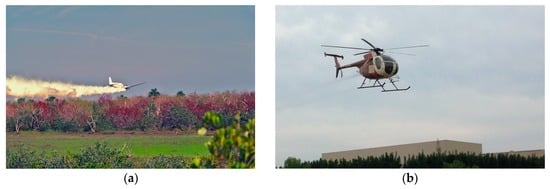 (a) An aerial adulticiding mission using fogging (Courtesy of G. Alan Curtis); (b) An aerial adulticiding mission using ultra-low volume (ULV) (Courtesy of Mark D. Latham).