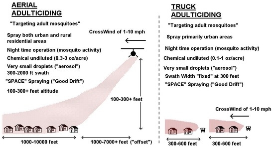 Adulticides and larvicides, delivered aerially or by ground vehicles, are important tools for mosquito control. Ultra-low volume (ULV) sprays have been the preferred method for delivery of mosquito control adulticides for nearly 60 years (Figure 2). ULV is the minimum effective volume of the product without any further dilution [26]. The history and development of ULV applications for mosquito adulticides are reviewed in more detail elsewhere [27,28,29].