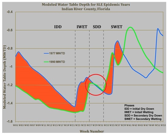 The epidemic signature of rainfall and drought events for WNV and SLEV transmission in Florida. MWTD, modeled water table depth (Courtesy of Jonathan F. Day).