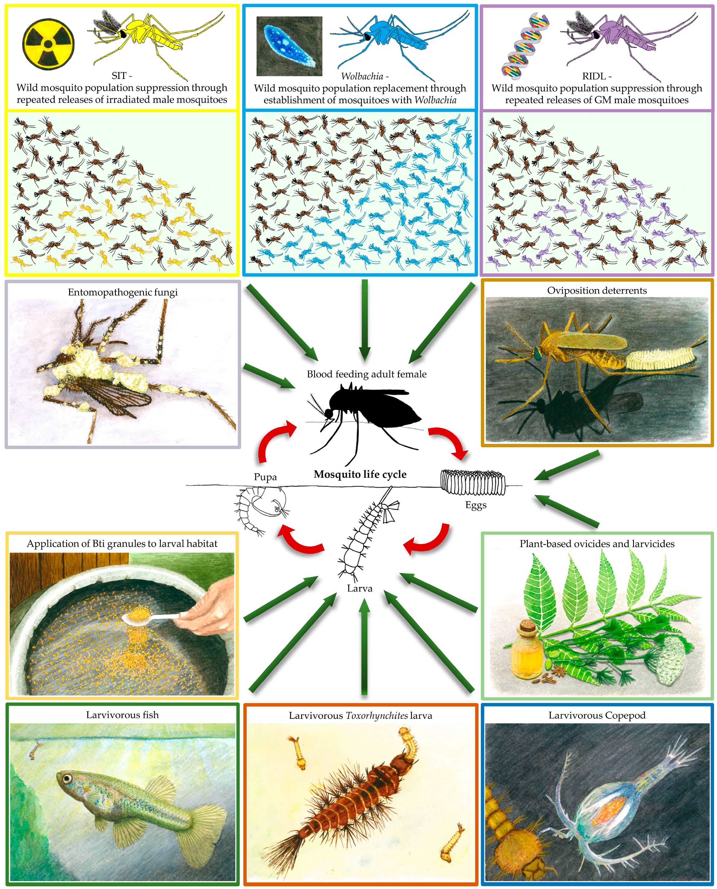 Mosquito biocontrol strategies targeting different stages of the mosquito lifecycle.
