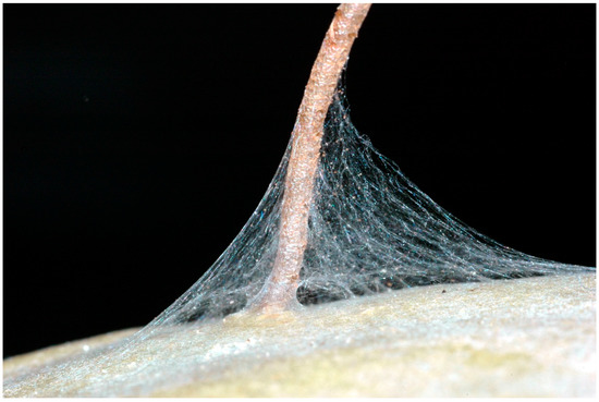 Silk covered arena formed by neonate Cactoblastis cactorum caterpillars at the base of the egg stick.