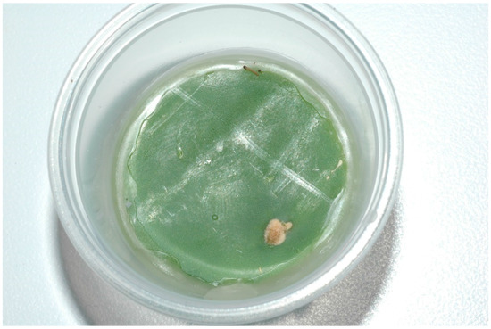 Circular disks, 32 mm diameter, were cut from cladodes and placed at the bottoms of 20 mL capacity transparent plastic portion-control containers (Figure 2). Each cactus disk was sealed to the sides of the container along its circumference with hot wax to prevent the disk from desiccating and the caterpillars from gaining easy access to the interior of the cactus from the cut edge. Care was taken to assure that the exposed surfaces of the disks were intact, lacking punctures that might allow the caterpillars to access the interior. A total of 61 of these containers were established and a single unfed and newly hatched C. cactoblastis caterpillar placed in each. Transparent tops were placed on the containers to seal them and the behavior of the caterpillars observed intermittently over a 48 h period to determine if they were successful in entering the plant. Using the same experimental setup, groups of five newly hatched and unfed caterpillars were placed in each of 13 additional containers and similarly observed. A small drop of water was placed near the caterpillars in both experimental setups at the initiation of the study. The caterpillars readily imbibed the water.