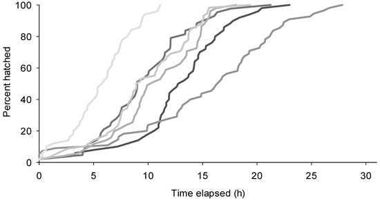 When held at 21 ± 3 °C and 50%–70% RH, eclosion of caterpillars from an egg stick was markedly asynchronous with an average of 2.2 ± 0.23 eclosion events per hour (Figure 4). On average 20.1 ± 2.7 h elapsed between the eclosion of the first and last caterpillars from an egg stick.