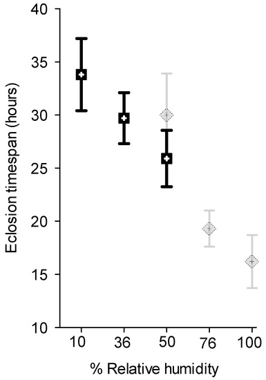Pettey [2] noted that when he covered a container containing egg sticks with a wet cloth to cool them down to slow hatching they hatched sooner. He attributed this to the softening of the egg shells by the moisture. The results reported here support this observation. For the first experiment, the time elapsed between the hatching of the first and last eggs at 100% RH was 16.2 ± 2.5 h, at 75% RH, 19.3 ± 1.7 h and at 50% RH, 30.0 ± 3.9 h. There was no significant difference between the 100% RH and 75% RH treatments, but both were significantly different from the 50% RH treatment (ANOVA F = 6.71, p = 0.006; Duncan’s Multiple Comparisons p < 0.05, Figure 5). The percentage of eggs that hatched did not differ among RHs, exceeding 90% for all treatments (Kruskal-Wallis ANOVA of Ranks on Arcsin Square Root transformations, H = 3.7, p = 0.16). In the second experiment, conducted at a lower range of RHs, time elapsed between the hatching of the first and last egg for egg sticks held at 50% RH was 25.8 ± 3.4 h, at 35% RH, 29.7 ± 2.4 h and at 10% RH, 33.8 ± 3.4 h (Figure 5). There was no significant difference among treatments (ANOVA, F = 1.62, p = 0.25). However, there was a marked increase in the number of eggs that failed to hatch at decreasing RH. The percentage of eggs that failed to hatch was 7.9% ± 0.04% when eggs were held 50% RH, 29.7% ± 0.08% when held at 35% RH and 45.1% ± 0.15% when held at 10% RH (ANOVA on Arcsin Square Root transformations, F = 3.6, p = 0.056).