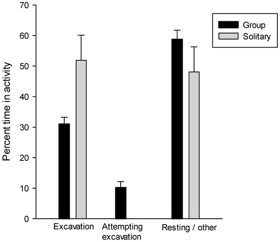 Solitary individuals spent 51.9% ± 8.2% of their time excavating and 48.1% ± 8.2% in other activities (Figure 6 and Table 3). In groups of 5–8 caterpillars, individuals spent 31.04% ± 2.2% of their time excavating (range 20.4%–38.9%), 10.20% ± 1.9% attempting to enter the excavation (range 4.1%–19.4%), and 58.7% ± 3.0% moving about or resting (range 48.9%–74.3%, Table 4 and Figure 6). The difference in percent of time excavating was significantly different between the solitary and grouped caterpillars (Mann-Whitney Rank Sum Test U = 22.0, p = 0.03), but there was no significant difference between the sum of the percentages of time spent excavating and attempting to excavate by individuals in groups compared with the percent of time spent excavating by individuals (Mann-Whitney Rank Sum Test U = 9.0, p = 0.54).