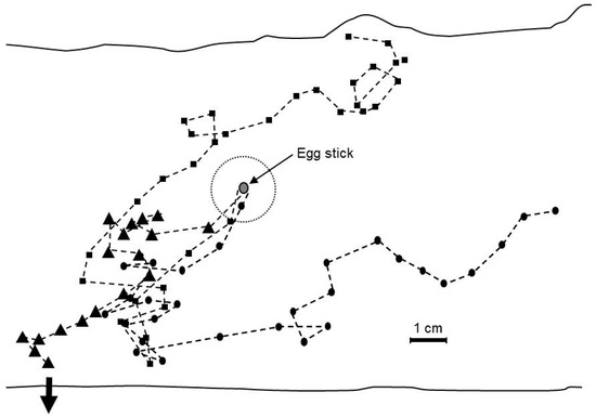 Previous studies showed that as the caterpillars move about they mark the substrate with a pheromone secreted from their mandibular glands which serves to maintain the aggregate by confining their movements to linear trails [8,9]. A study was conducted to test the hypothesis that the neonate caterpillars wander only short distances prior to and during the excavation process because they limit their activity to a small arena around the base of the egg stick that is marked with the pheromone. This was tested by spraying whole cladodes with the mandibular gland extract with the expectation that if the arena was defined by the mandibular gland secretion the caterpillars, rather than confining their activity to the base of the egg stick, would wander at random and independently over the whole of the cladode. The elongate mandibular glands extend the whole length of the body and their contents are readily extracted in hexane. To prepare the extract, 50 pairs of mandibular glands were dissected from 6th instar caterpillars following the procedure of [9]. The glands were ground in hexane and centrifuged. The supernate was drawn off and adjusted to 50 mL with additional hexane. Approximately 0.03 mL/cm2 of the solution was sprayed with a Preval© sprayer (Chicago Aerosol Co., Coal City, IL, USA) as a fine mist onto both sides of a section of a cladode (surface area = 163.4 ± 14.6 cm2) the cut ends of which were sealed with hot paraffin. After the solvent had evaporated, an egg stick within 48 h of hatching was attached to the cladode as described above. The behavior of the newly eclosed caterpillars was compared to their behavior on cladodes sprayed with hexane only as a control. This experiment was replicated 10 times with different egg sticks and different cladodes. Eggs sticks contained an average of 53.1 ± 1.7 eggs. Cladodes were maintained at approximately 21 °C at a mean RH of 76% in plastic boxes.