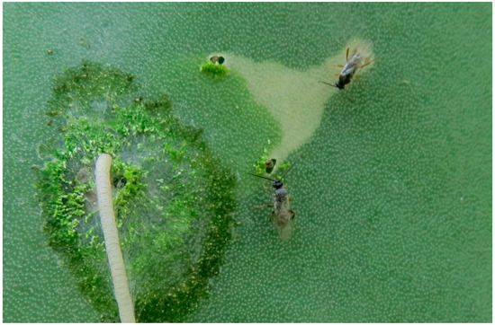 The parasitoid Apanteles opuntiarum (Hymenoptera: Braconidae) attacking first instar larvae of Cactoblastis cactorum.