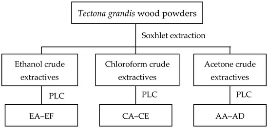 Schematic representation of the extraction and fractionation performed for T. grandis wood extractives. Notes: PLC: Preparative layer chromatography (Silica gel 60 F254 2 mm, 20 cm × 20 cm); EA–EF = fractions obtained from ethanol crude extractives; CA–CE = fractions obtained from chloroform crude extractives; AA–AD = fractions obtained from acetone crude extractives.