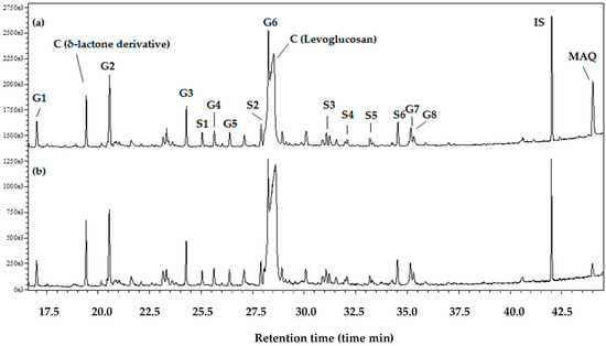 Pyrogram obtained in the Py-GC/MS of T. grandis heartwood (a) and chloroform-extracted residues (b). Legends: IS = internal standard (n-eicosane); G1 = guaiacol; G2 = 4-methylguaiacol; G3 = 4-vinylguaiacol; G4 = eugenol; G5 = vanillin; G6 = trans-isoeugenol; G7 = coniferaldehyde; G8 = trans-coniferyl alcohol; S1 = syringol; S2 = 4-methylsyringol; S3 = 4-vinylsyringol; S4 = 4-allylsyringol; S5 = syringaldehyde; S6 = trans-4-propenylsyringol; G1–G8 = pyrolysis products from guaiacyl lignin unit; S1–S6 = pyrolysis products from syringyl lignin unit; C = pyrolysis products from carbohydrate; and MAQ = 2-methylanthraquinone.