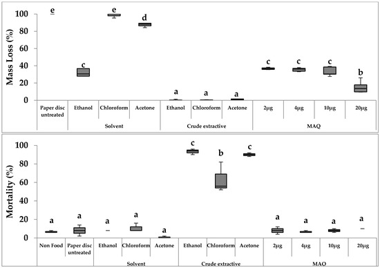 Box plot of mass loss and mortality of R. speratus in no-choice feeding tests using filter paper discs treated with T. grandis crude extractives and MAQ. Notes: Treatments with the same letters in the same graphic are not statistically different at p < 0.05, as determined by Duncan’s test; Dosages of the extractives and MAQ are indicated in Table 1.