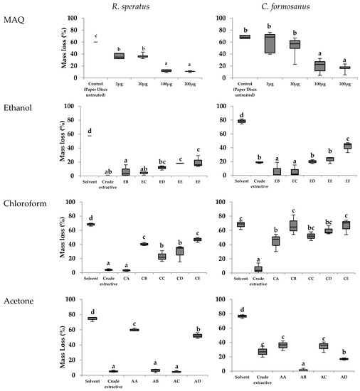 Box plot of the mass loss registered in R. speratus and C. formosanus no-choice feeding tests using fractions of T. grandis crude extractives and MAQ. Notes: Treatments with the same letters in the same graphic are not statistically different at p < 0.05, as determined by Duncan’s test; EB-EF, CA-CE, and AA-AD are referred to Figure 1 and Table 2; Dosages of extractives and MAQ are indicated in Table 2.