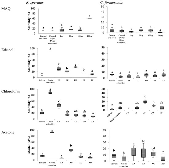 Box plot of the mortality observed for R. speratus and C. formosanus in no-choice feeding tests using fractions of T. grandis crude extractives and MAQ. Notes: Treatments with the same letters in the same graphic are not statistically different at p < 0.05, as determined by Duncan’s test; EB-EF, CA-CE, and AA-AD are referred to Figure 1 and Table 2; Dosages of extractives and MAQ are indicated in Table 2.