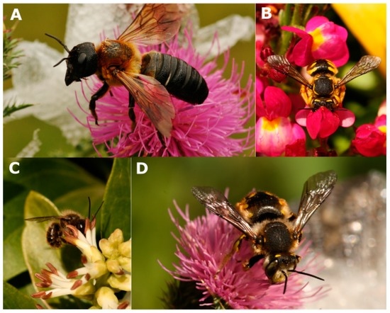 - Tonietto, R.; Ascher, J.S. Occurrence of the Old World bee species Hylaeus hyalinatus, Anthidium manicatum, A. oblongatum, and Megachile sculpturalis, and the native species Coelioxys banksi, Lasioglossum michiganense, and L. zophops in Illinois (Hymenoptera: Apoidea: Colletidae, Halictidae, Megachilidae). Gt. Lakes Entomol. 2008, 41, 200–203. [Google Scholar]