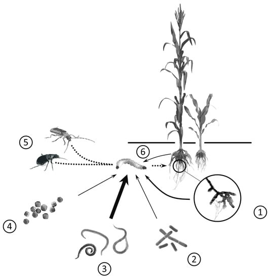While insect herbivory causes severe damage to plant production in natural systems, their impact on agroecosystems is even more pronounced due to landscape simplification (e.g., loss of plant diversity and reduction of trophic interactions) [6]. Indeed, annual crop losses from damage caused by insects could be more than 15% [7]. In this context, it is worthwhile to consider below-ground herbivores that sustain a wide diversity and feed on various plant tissues, such as roots, rhizomes, and storage organs [8,9]. Root pests have always caused extensive damage to crops. For instance, the aphid root-feeding Daktulosphaira vitifoliae, the grape phylloxera, had almost destroyed the entire European grape production [10], and root herbivores are still responsible for a large part of yield loss at the global scale [11]. Indeed, root pests, such as wireworms (Coleoptera: Elateridae), feed on a wide range of crops, including cereals, potato, carrot, sugar beet, and fruit orchards [12]. The cost of damage caused by the western corn rootworm (Diabrotica virgifera virgifera) in Europe and in USA, could be much greater than $1 billion annually [13]. In the southern hemisphere, the damage caused by the greyback canegrubs (Dermolepida albohirtum) cost over $10 million to sugarcane producers [14]. Despite the economic importance of root herbivores, research aiming at developing sustainable solutions to diminish their impact remains scarce, compared to those pertaining to above-ground herbivores. One of the major reasons is certainly their unclear life cycle, which leads to the “out of sight, out of mind” paradigm, as argued by Hunter [8]. Indeed, their development in soils complicates the detection of infestations and, consequently, the resultant damages over the economic thresholds are generally disclosed much later than useful. In addition, even when they are readily detected, their underground mode of life limits the control of root herbivores by chemical inputs, which generally requires direct exposure to bio-active compounds. On the other hand, since the dispersion of root herbivores is comparatively limited in soils, they are more persistent locally, as compared to above-ground pests [15]; this would favor constant and localized applications of bio-control agents in the field.