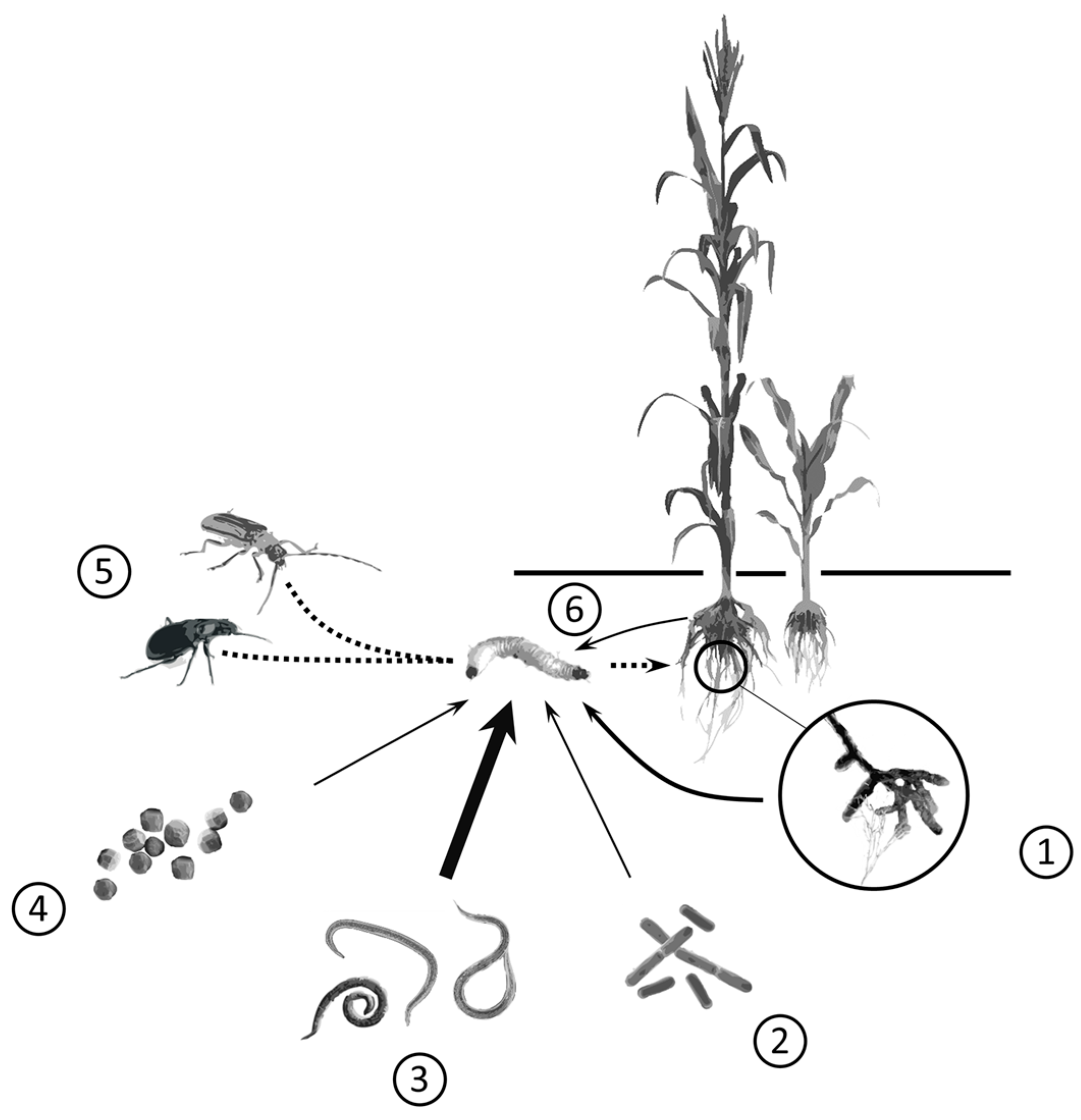 Biological control agents against root insect pests. (1) Entomopathogenic fungi (occasionally endophytic); (2) free-living soil microbes, such as Trichoderma or Bacillus spp.; (3) entomopathogenic nematodes; (4) viruses, such as Baculovirus; (5) arthropod predators; and (6) plant endogenous defenses and priming. Arrows represent trophic links. Different line thicknesses represent strengths of interactions, with thicker lines representing stronger potential biocontrol effectiveness than thinner lines. Dashed lines represent the currently weakest potential for biological control agents, as described in the text.