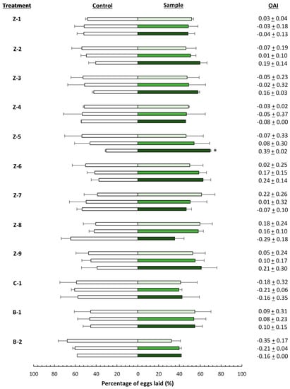 ) mg·L−1. Asterisks indicate significant differences (p < 0.05) in oviposition activity between treated and control leaves (n = 4). OAI: oviposition activity index.