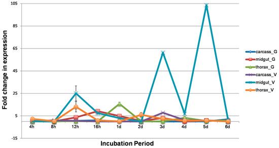 The fold change in CQ G1A1 expression before and after infection with WNV was evaluated in the midgut, thorax, and carcass tissues dissected from two Cx. p. quinquefasciatus populations (CPQG and CPQV). A threefold or greater change in expression was detected in WNV infected midgut samples from the CPQG population at four time points, 12 hpi, 16 hpi, 1 dpi, and 3 dpi (Figure 1). The highest fold change in CQ G1A1 expression was at 16 hpi (Figure S2). WNV was detected in midgut tissue from the CPQG population at 12 hpi and 3 dpi but not at 16hpi, suggesting CQ G1A1 might be involved in an antiviral response as presence of WNV corresponded to low CQ G1A1 expression (fold change ≥ 3; Figure 1 and Figure 2). Higher fold change in expression of CQ G1A1 in midgut tissue from the CPQV population was found for most time points compared to CPQG, where fold change ranged from 103 to 6.9, with highest fold change at 3 dpi and 5 dpi (Figure 1). However, at 4 hpi, 8 hpi, 2 dpi, and 6 dpi there was little CQ G1A1 expression change between the treatment groups. WNV was detected at most time points, suggesting that CQ G1A1 expression in this population may not have a role in antiviral responses (Figure 2). Comparing CQ G1A1 expression between midgut tissues from both populations revealed only two time points with significant differences, 1 dpi and 3 dpi (p < 0.05). The large increases in CQ G1A1 expression in infected midgut tissue could suggest a role in WNV infection that is population specific. Greater than 3-fold change in expression was seen at 1 and 4 dpi in thorax from the CPQG population and detected in thorax from CPQV at 12 hpi and 2 dpi (Figure 1). WNV was not detected at these time points in either population but was detected by 6 dpi (Figure 2). WNV induced change in expression of CQ G1A1 > 3-fold was detected in carcass from the CPQV population (3 dpi) only. The change in expression in these tissues could indicate a role in other metabolic processes. There were few significant within population tissues-specific CQ G1A1 expression differences, which supports CQ G1A1 being ubiquitously expressed although WNV influences the expression.