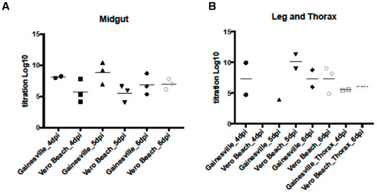 Titration of WNV in tissues dissected from two populations of Cx. quinquefasciatus (CPQG and CPQV) at different incubation periods after infection. (A) Titration of WNV from midgut tissues; (B) Titration of WNV from leg and thorax tissues. Gainesville = CPQG; Vero Beach = CPQV; dpi = days post infection.