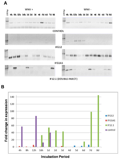CQ G1A1 gene expression analysis in RNAi injected Cx. quinquefasciatus (CPQG) midguts dissected at different incubation periods post WNV infection. (A) RT-PCR analysis of CQ G1A1 expression; (B) qRT-PCR analysis of CQ G1A1 expression. 100 bp = DNA molecular weight marker; h, hours; d, days; Control, noninjected; IFG12, injected with CQ G12A2 RNAi; IFG1A1, injected with CQ G1A1 RNAi; IF12.1, injected with CQ G12A2 and CQ G1A1 RNAi. + = WNV in blood meal, − = no WNV in blood meal.