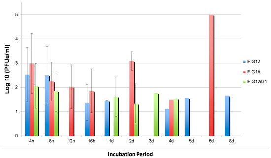 Titration of WNV in RNAi injected Cx. quinquefasciatus (CPQG) midguts dissected at different incubation periods post WNV infection. h, hours; d, days; IFG12, injected with CQ G12A2 RNAi; IFG1A1, injected with CQ G1A1 RNAi; IF12.1, injected with CQ G12A2 and CQ G1A1 RNAi.