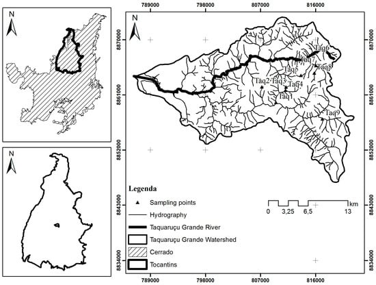 Samples were collected in nine streams located in Taquaruçu Grande river basin (Figure 1). Physical descriptions of the nine streams are presented in Table 1. Taquaruçu Grande is located in the central portion of the state of Tocantins, with 74% of its area of 46,307.31 ha in the Environmental Protection Area of Lajeado (APA Lajeado). Main anthropic pressures are occupation of rural areas by small properties exploring small-scale agriculture, cattle raising, and day-in tourism (activities in waterfalls and bathing areas for 4 to 6 h by neighboring populations), annual fire management of natural pasturelands, and road construction.
